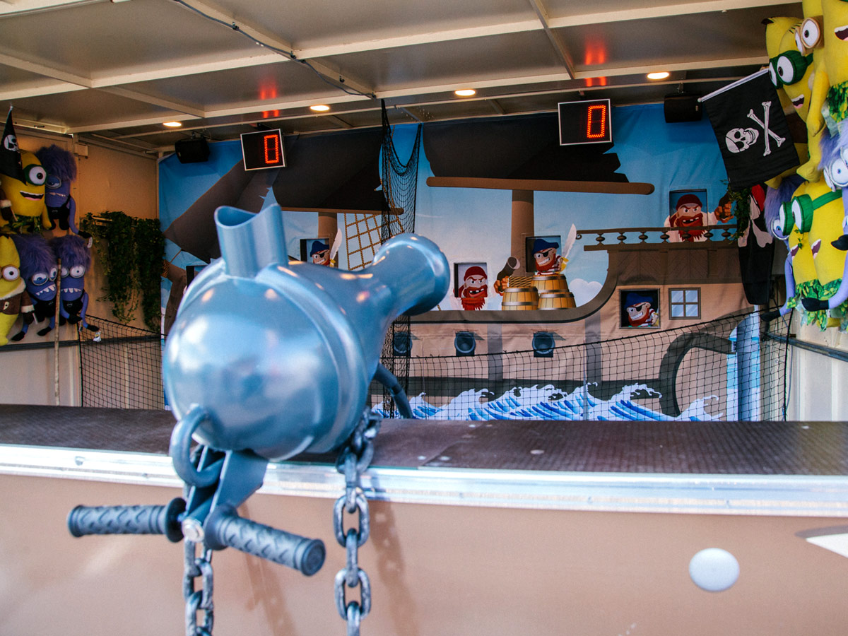 The pirate softball cannon was initially designed for a complete pirate-themed package (including track, decoration, lighting, sound effects, nets, etc.), but it is also suitable for medieval theme.