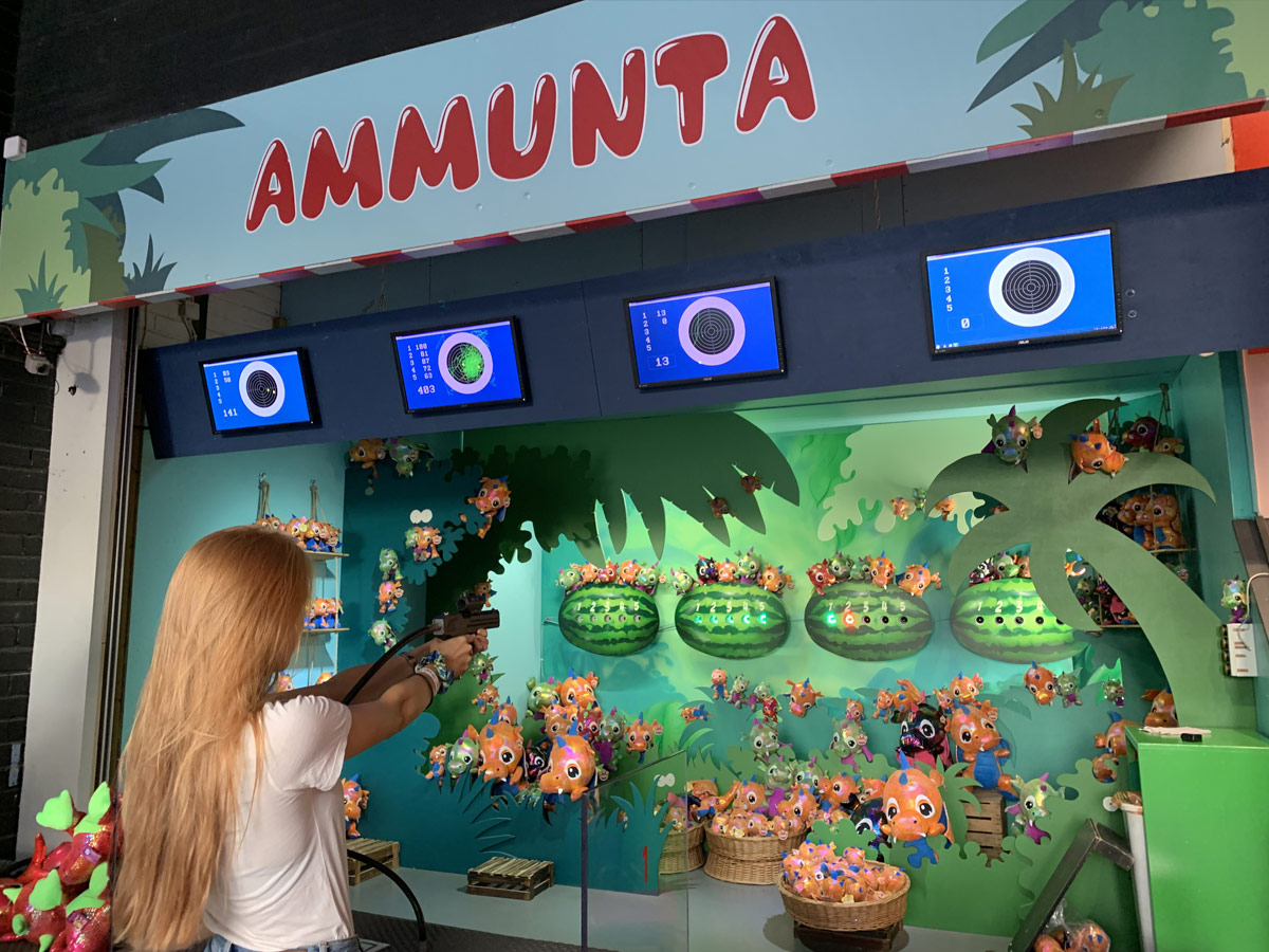 There are five shooting targets, each showing green – or red light, depending on the success of the shot. Final results are displayed on a screen placed above the targets.