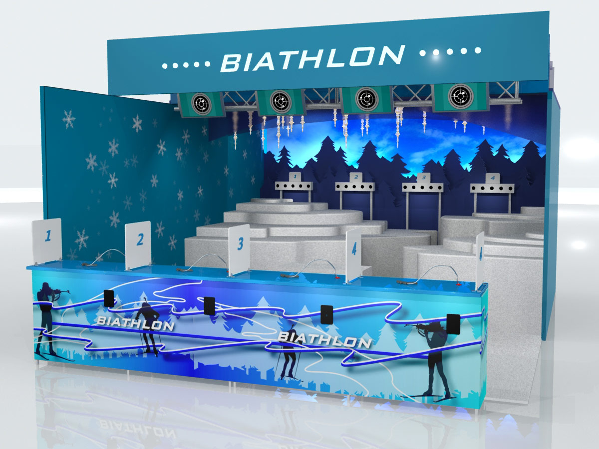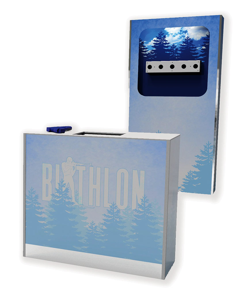 Based on our reliable optical shooting game for amusement parks we decided to develop a compact Biathlon shooting system for event organizers and rental companies. The whole game system fits on a single EUR pallet and is quickly set up for some fun shooting action.