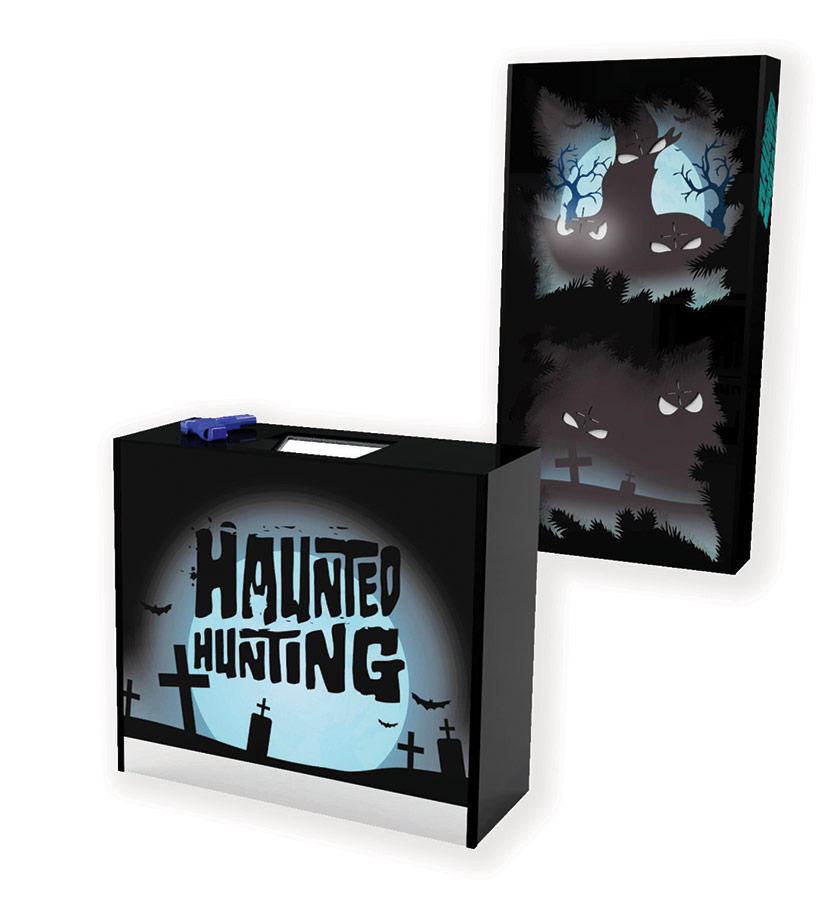 This is a Police Academy version of our compact Biathlon game. The difference besides using a pistol instead of a rifle is that the targets are spread up around the wall and light up in random order. Also, the pace slowly gets quicker making it more difficult to hit the targets towards the end of the game. The whole game system fits on a single EUR pallet for transport.